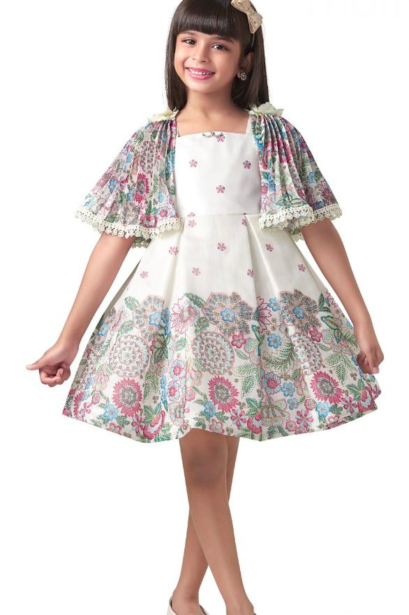 The Cream Floral Designer Sleeve Frock is a beautiful and elegant outfit crafted to give your little one a fresh and stylish look. The soft cream base with multicolor floral prints creates a charming appearance, while the unique designer sleeves add a touch of sophistication—perfect for parties and festive occasions.