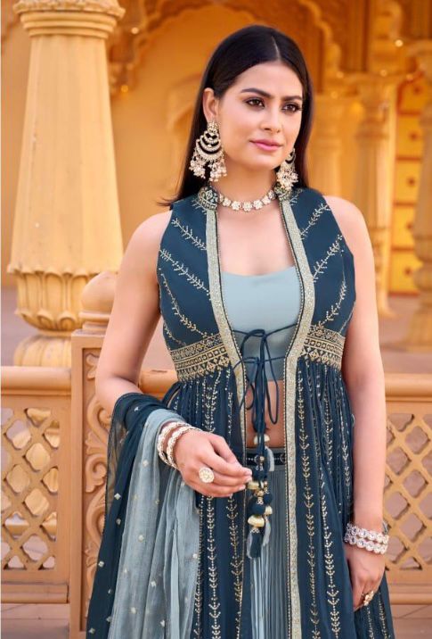 Unveil an aura of enchantment with the Mystic Blue Ensemble, where modern silhouettes meet timeless elegance. Crafted from lightweight georgette, this set features a stylish crop top paired with gracefully flowing plazo bottoms, complemented by a long shrug and a sheer dupatta. The deep blue shade adds a touch of mystery and sophistication, making it the perfect choice for festive occasions, evening celebrations, or cultural gatherings that call for effortless charm.