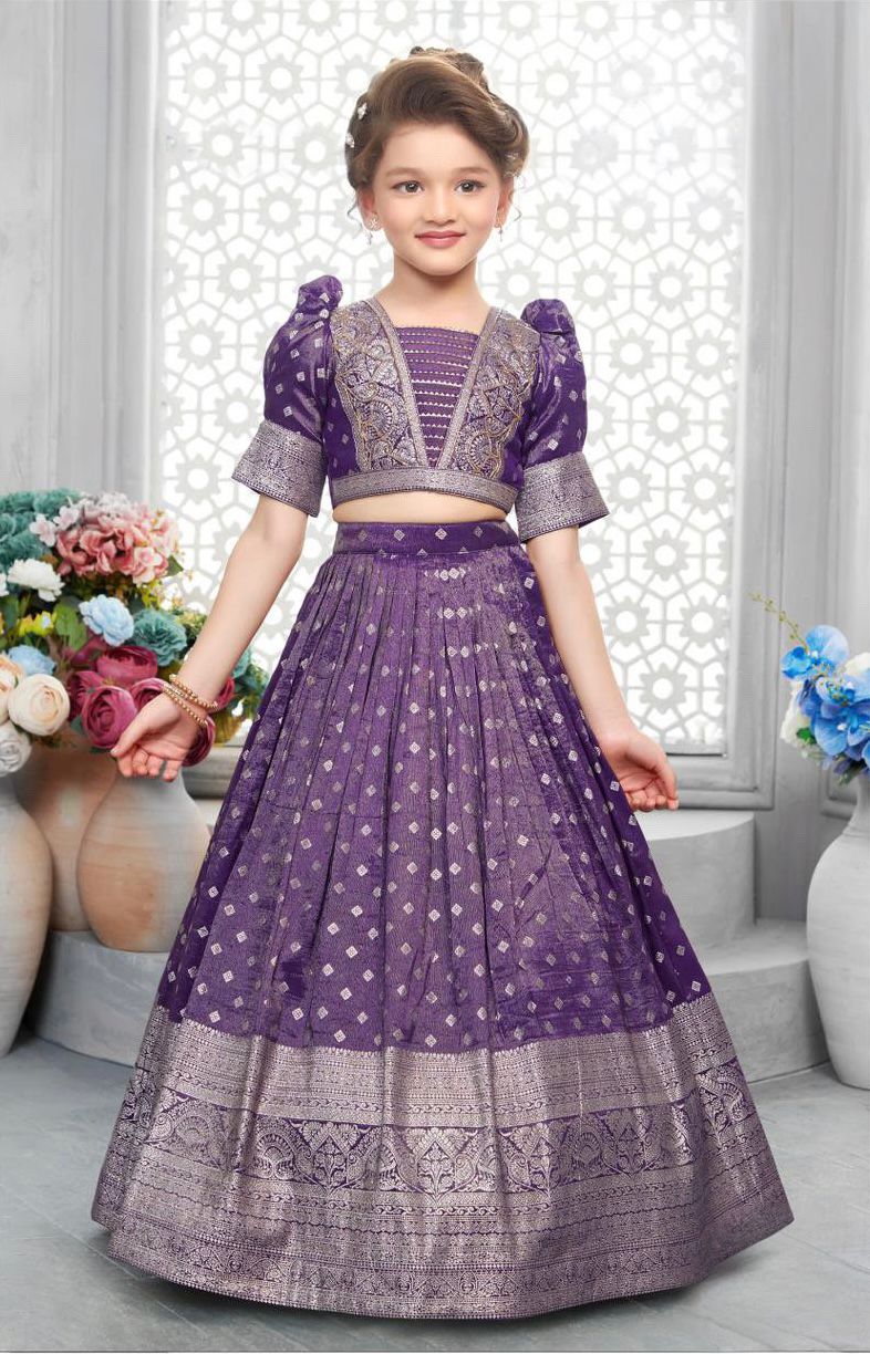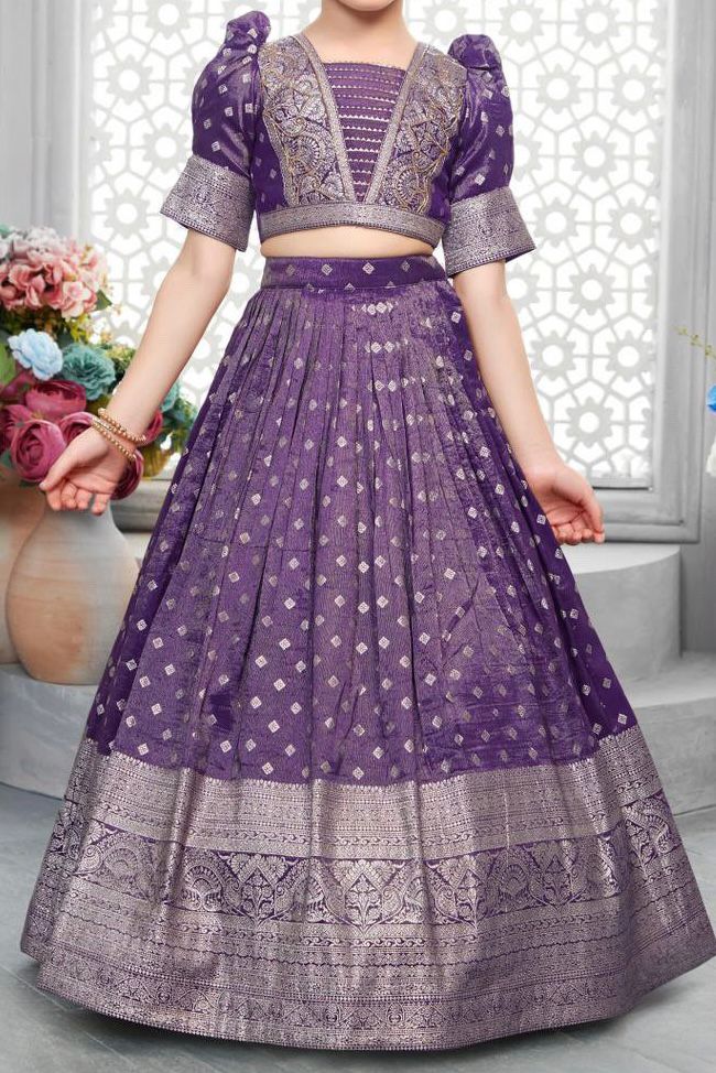 The crop top features delicate Cutdana work and charming puff sleeves, crafted in luxurious Benaras fabric for a royal yet youthful look.