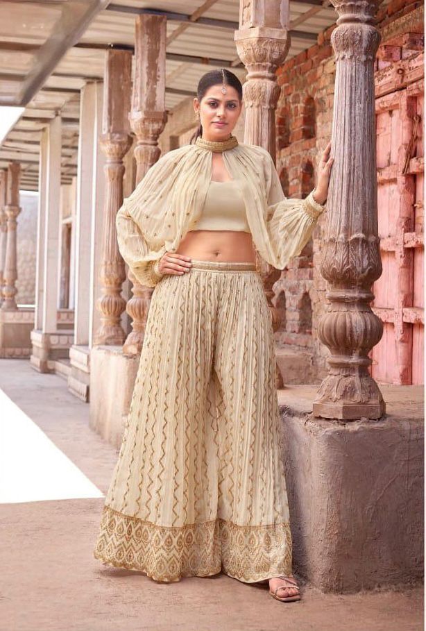 Sleek, sophisticated, and effortlessly graceful — the Velora Cream Set is designed for modern celebrations with a touch of timeless charm. This three-piece outfit features a sleeveless crop top and flowing plazo pants, tailored in soft georgette for fluid movement and comfort. The look is completed with a pleated, long-sleeved jacket highlighted by an intricately embroidered high neckline, adding definition and a subtle statement.