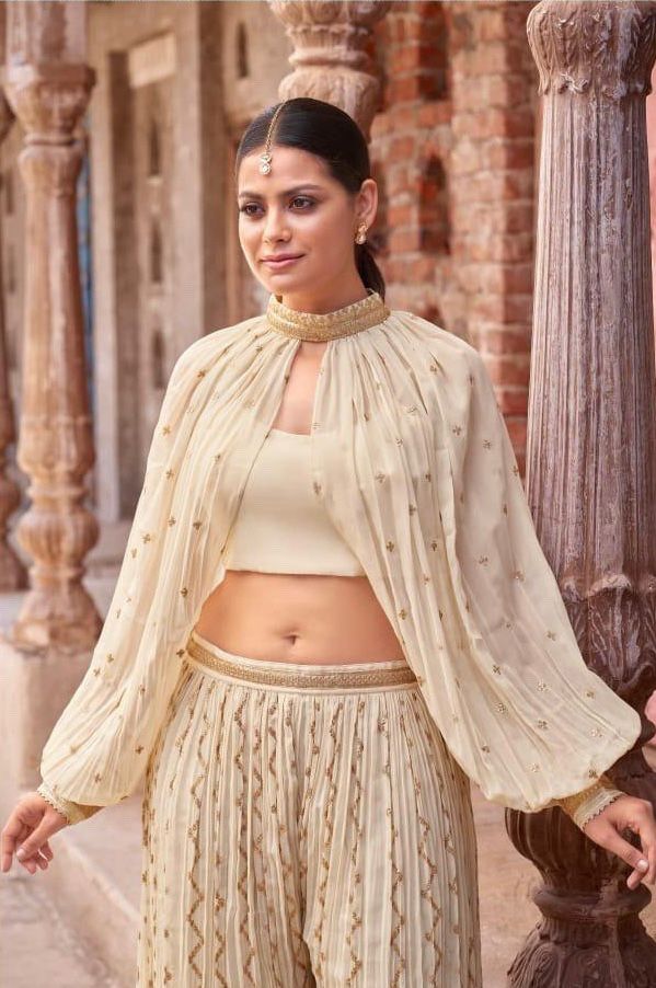 Design Elements: A sleeveless crop top paired with plazo pants and a pleated long-sleeved jacket featuring a high, embroidery neckline