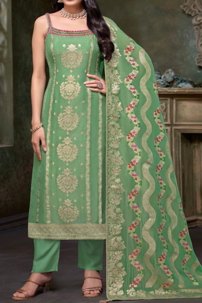 A timeless expression of tradition and allure. Crafted in Luxurious Green Benaras , this straight-cut outfit exudes a regal charm that’s perfect for festive and formal occasions. The intricately woven Benaras top pairs gracefully with matching pants and a coordinating dupatta, creating a look that’s effortlessly elegant and rooted in heritage.