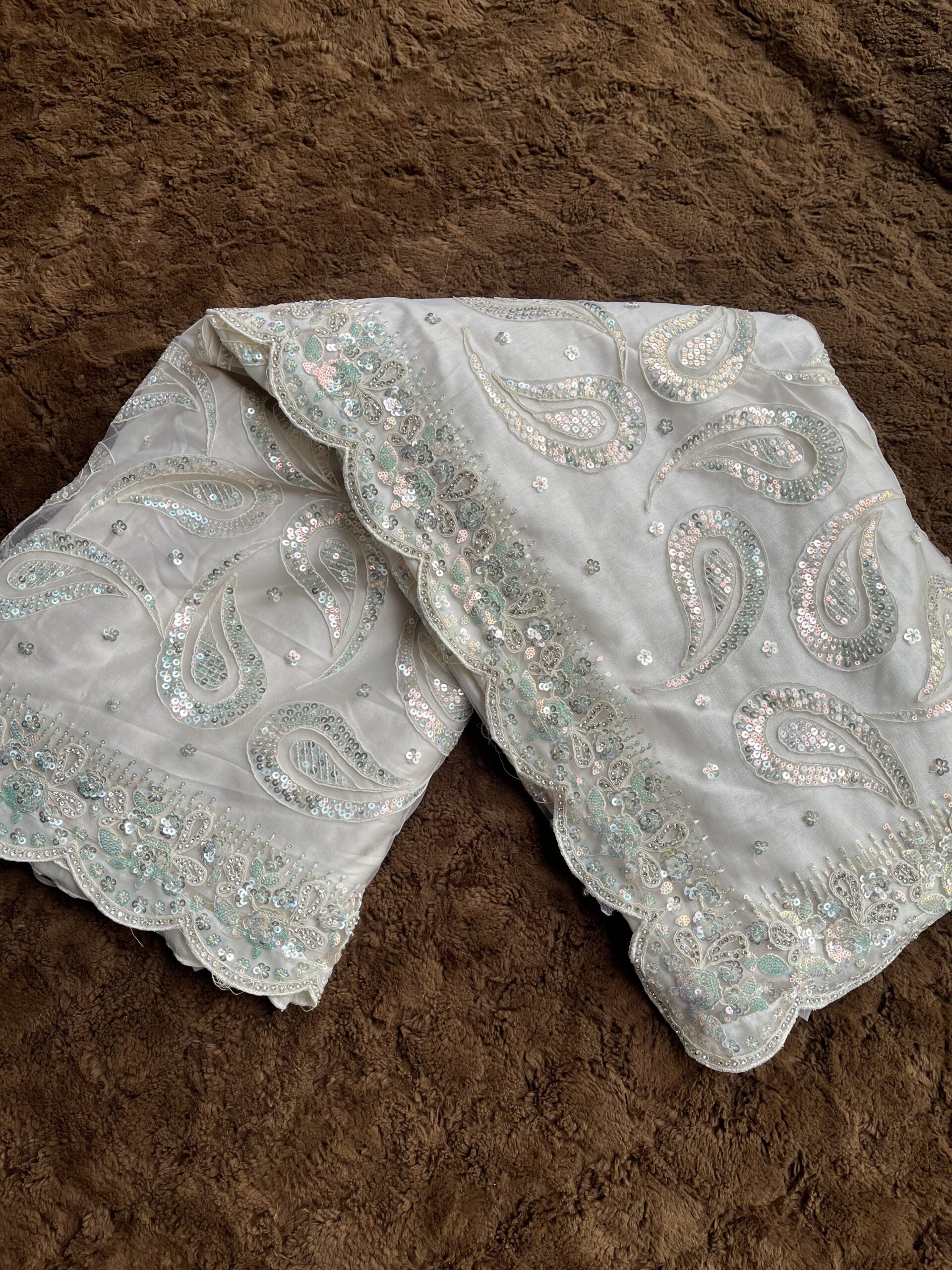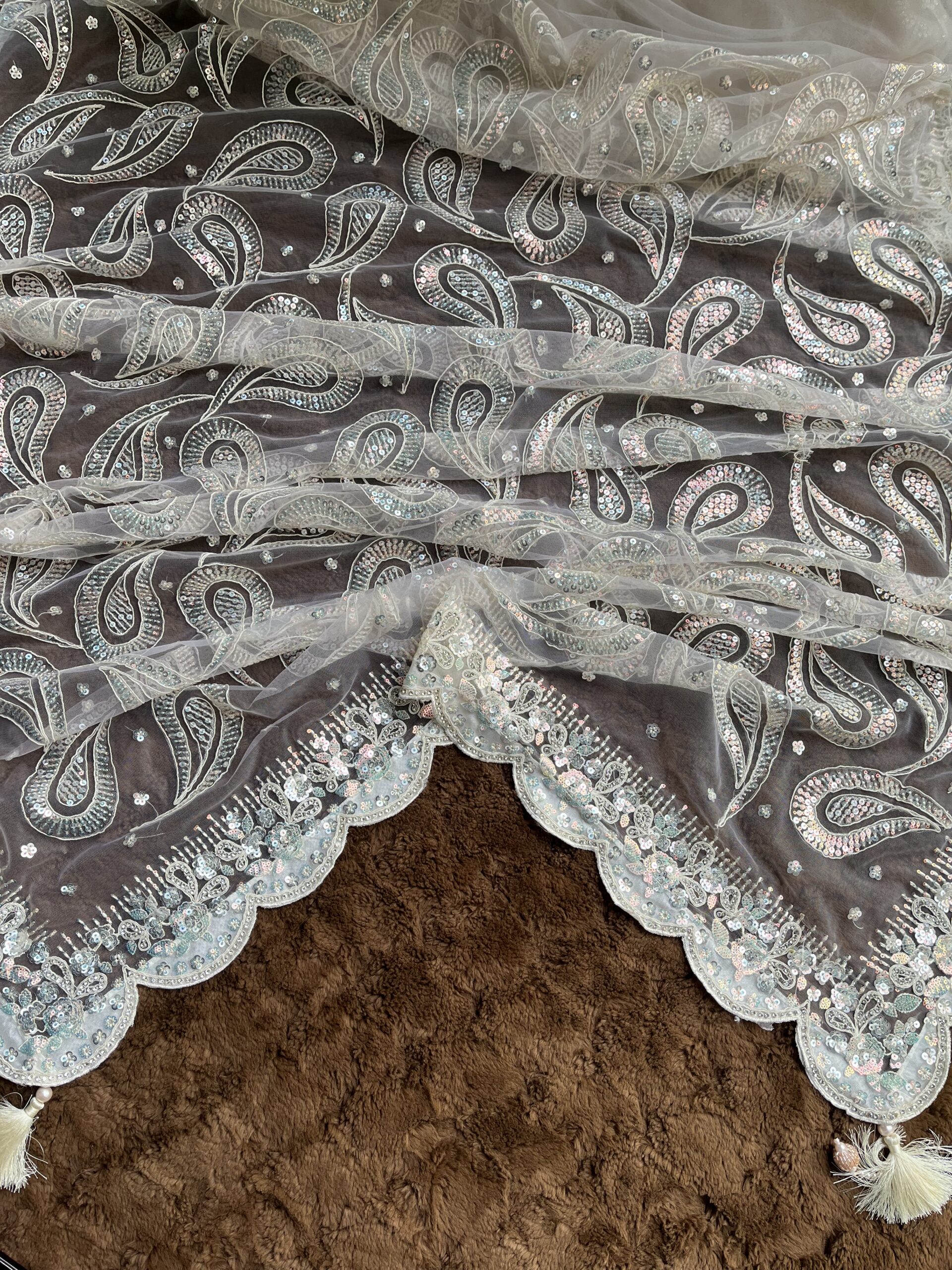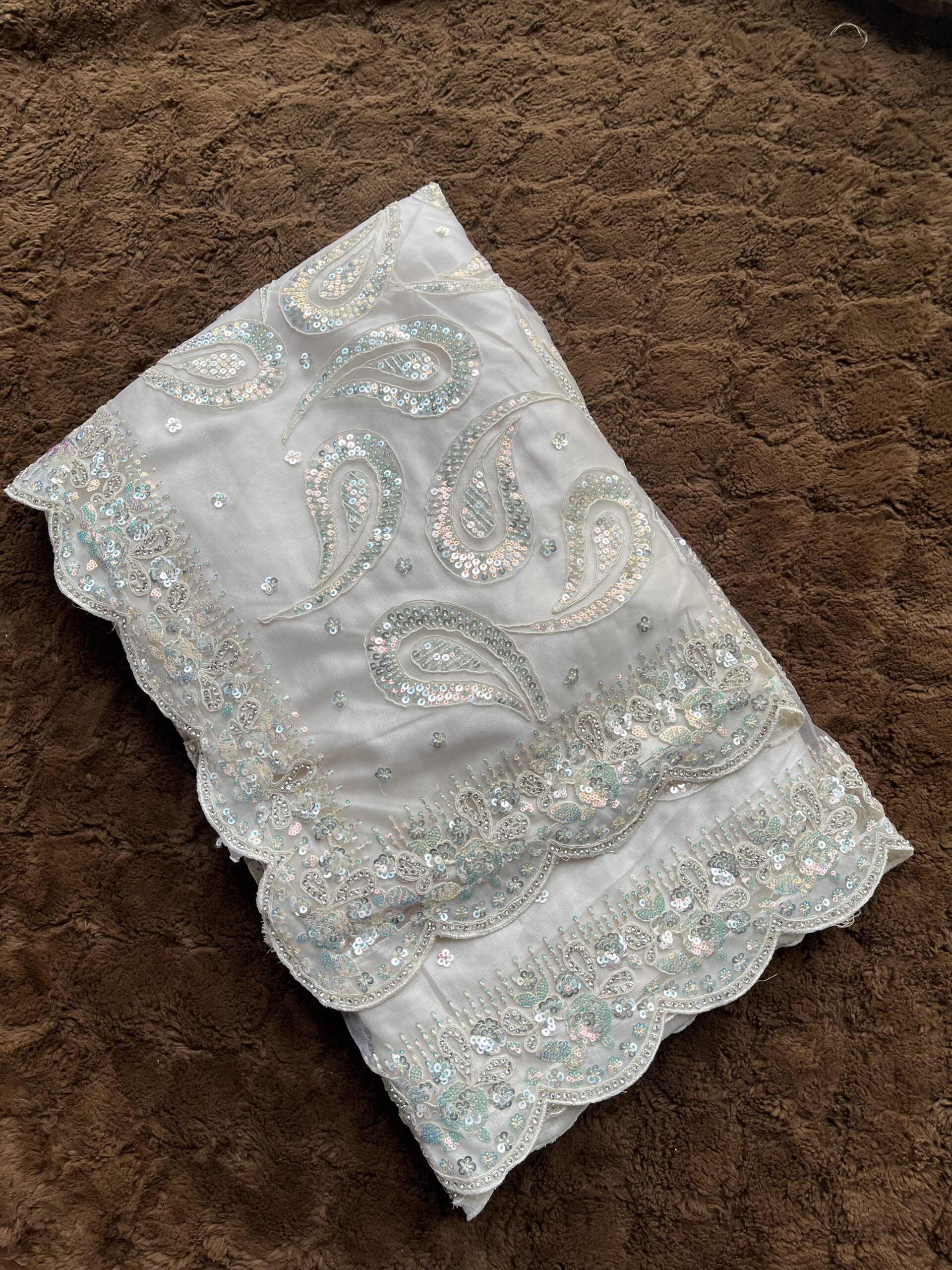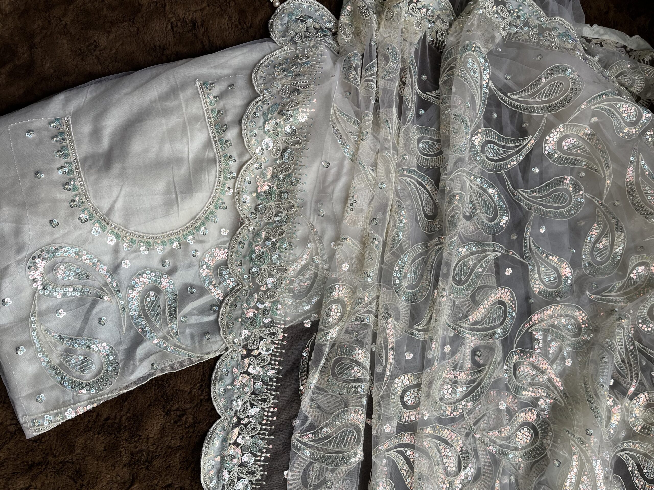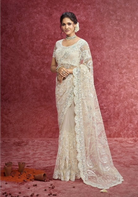 Embrace elegance with our White Netted Sequin Saree, crafted to add a soft sparkle to your special moments. The lightweight net material paired with delicate sequin work creates an effortlessly graceful look. Its airy texture enhances movement, giving you a serene and radiant presence.